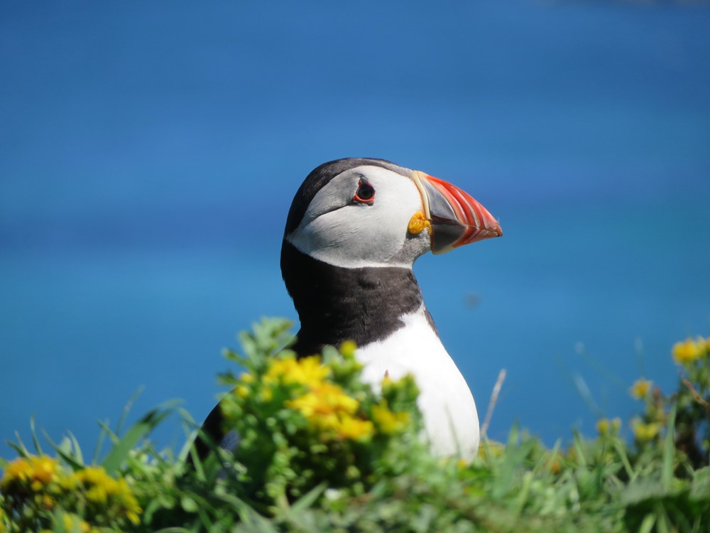 Monday morning was bright and sunny, and we set off (motoring again) to get to Lunga in the Treshnish Islands before the tourists descended on it. It is quite difficult to land on Lunga which has a very rocky shoreline, but the effort is well worth it. We crept up the hill quietly and arrived at the main puffin colony to find that it was still well inhabited with puffins! It is a very rewarding experience to sit among the puffins quietly and watch their antics. For people with a more dedicated interest in sea-birds there are plenty of walks on the island to take you close to the nests of guillemots and shags. As we reluctantly left at lunchtime the trip boats for the day started to arrive as well, so we had been lucky to only have to share the island with the birds and rabbits!