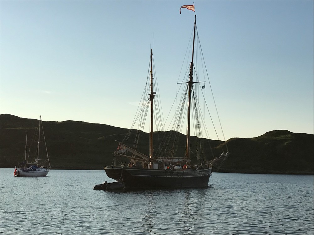 Motoring carefully into the shelter of Gometra Harbour which lies between the islands of Gometra and Ulva, at 17.00 we found there were several yachts already at anchor but there was plenty of space for “Explorer”. The sun continued to beat down and we were able to spend the evening on deck enjoying watching other boats arrive including a classic yacht and a small cruise boat. Dinner on deck was sublime and the sunset that evening was fabulous.