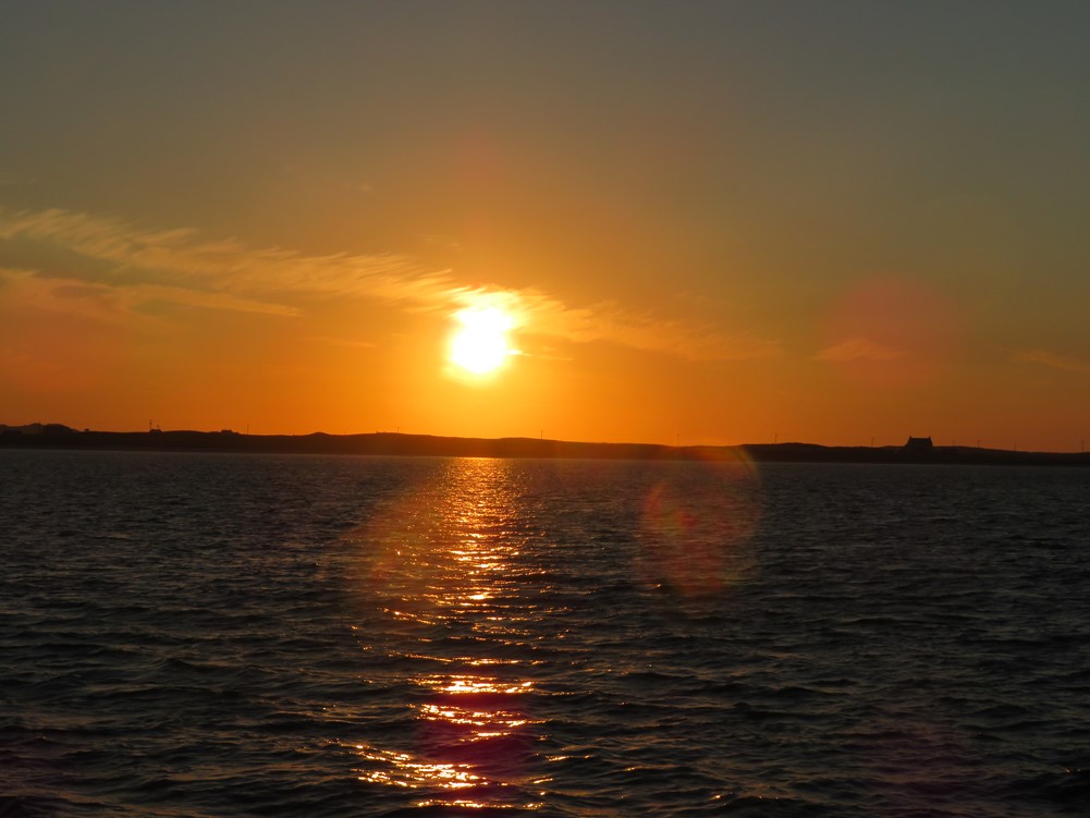 It was still a wonderfully sunny day with only light winds, so we decided to head over to Gott Bay, Tiree where visitor’s moorings had recently been laid. Historically yachts have been reluctant to visit Tiree as it is a very flat island and the anchorage at Gott Bay is exposed. The moorings are certainly very helpful but some of them are quite close inshore so do run your tidal range calculations when selecting one. It was my first visit to Tiree, so I was keen to have a look round and found that the village of Scarinish is about 10 minutes’ walk away. Evening meals are available at the Scarinish Hotel and there is also a well-stocked Co-op. There are lots of stunning beaches on Tiree and if time permits it would be interesting to hire a car and have a tour of the island. Back on board “Explorer”, the sunshine continued and there was another stunning sunset which was clear to see over Tiree’s flat horizon!